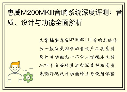 惠威M200MKIII音响系统深度评测:音质、设计与功能全面解析