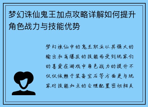 梦幻诛仙鬼王加点攻略详解如何提升角色战力与技能优势
